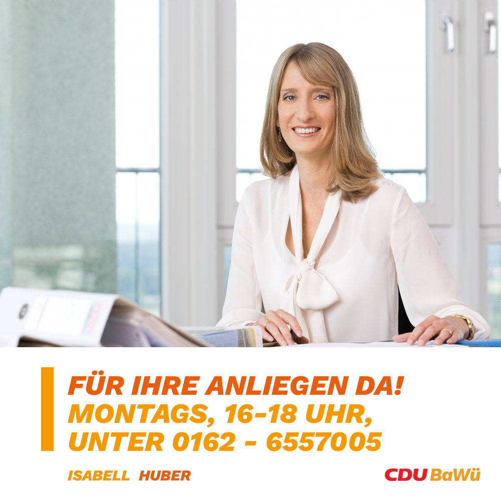 Nach zahlreichen Telefonsprechstunden, freut sich die CDU-Landtagsabgeordneten Isabell Huber über die rege Teilnahme und wird die Telefonsprechstunde weiterhin wöchentlich anbieten. Neu ist der direkte Draht zur Abgeordneten Isabell Huber persönlich unter der Telefonnummer: