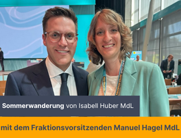 Sehr herzlich lade ich Sie zu meiner diesjährigen Sommerwanderung entlang des Neckarsulmer Scheuerberges ein! Dieses Traditions-Event bildet auch in diesem Jahr wieder den schönen Abschluss meiner Sommertour, bei der ich unter dem Motto „Huber packt an!“ in zahlreichen Unternehmen als „Praktikantin“ aus Industrie und Handwerk mit anpacken werde. Dabei ist es mir eine große Freude, dass Manuel Hagel MdL, unser geschätzter Fraktionsvorsitzender der CDU-Landtagsfraktion, Landesvorsitzender und Spitzenkandidat der CDU Baden-Württemberg, sein Kommen zugesagt hat.