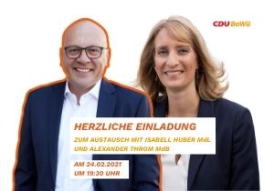 Die örtliche CDU-Landtagsabgeordnete Isabell Huber sowie der örtliche CDU-Bundestagsabgeordnete Alexander Throm laden alle Bürgerinnen und Bürger aus dem gesamten Weinsberger Tal sowie Löwenstein und Wüstenrot für Mittwoch, 24.02., ab 19:30 Uhr zu einem Austausch per Videokonferenz ein. Im Rahmen dieses Austauschs zu aktuellen Themen stehen Isabell Huber und Alexander Throm gerne für Ihre Fragen und Anliegen zur Verfügung. Für eine Teilnahme melden Sie […]