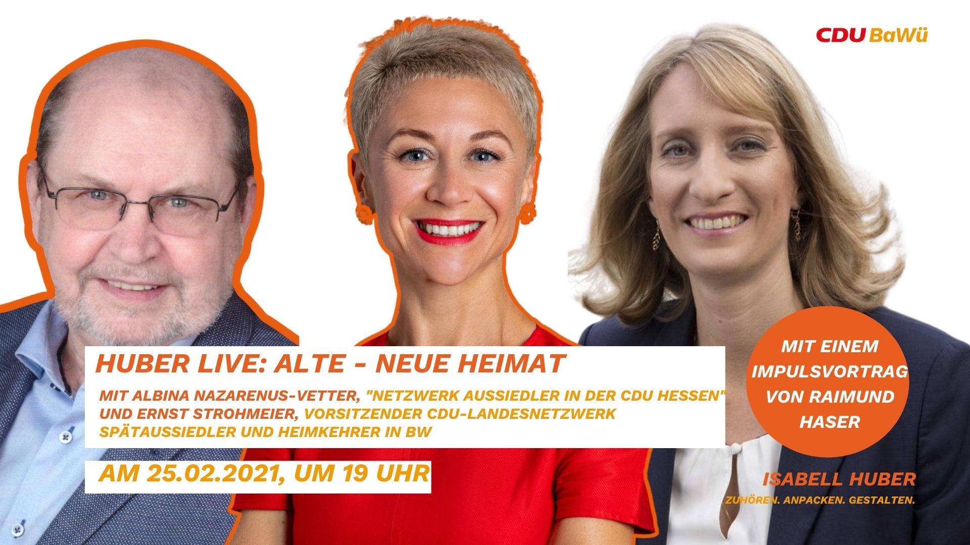 Isabell Huber MdL lädt zu einer Online-Gesprächsrunde mit Albina Nazarenus-Vetter vom "Netzwerk Aussiedler in der CDU Hessen" (UdV) und Ernst Strohmaier, Vorsitzender des CDU-Landesnetzwerkes Spätaussiedler und Heimkehrer in Baden-Württemberg ein. Gemeinsam tauschen wir uns am 25.02.2021 um 19:00 Uhr über die neue und alte Heimat, die unterschiedlichen Erfahrungen und Themen, die bewegen, aus. Raimund Haser, Beauftragter für […]