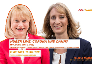 Der Termin findet als Facebook Live am 11. Februar ab 19.30 Uhr auf meiner Facebook-Seite facebook/isabellhubermdl statt. Ich freue mich auf einen regen Austausch mit Karin Maag MdB und mit Ihnen! Die Corona-Pandemie stellt unser Gesundheitssystem in den letzten Monaten auf eine harte Probe. Das medizinische Personal arbeitete am Anschlag. Gemeinsam mit Karin Maag, der […]